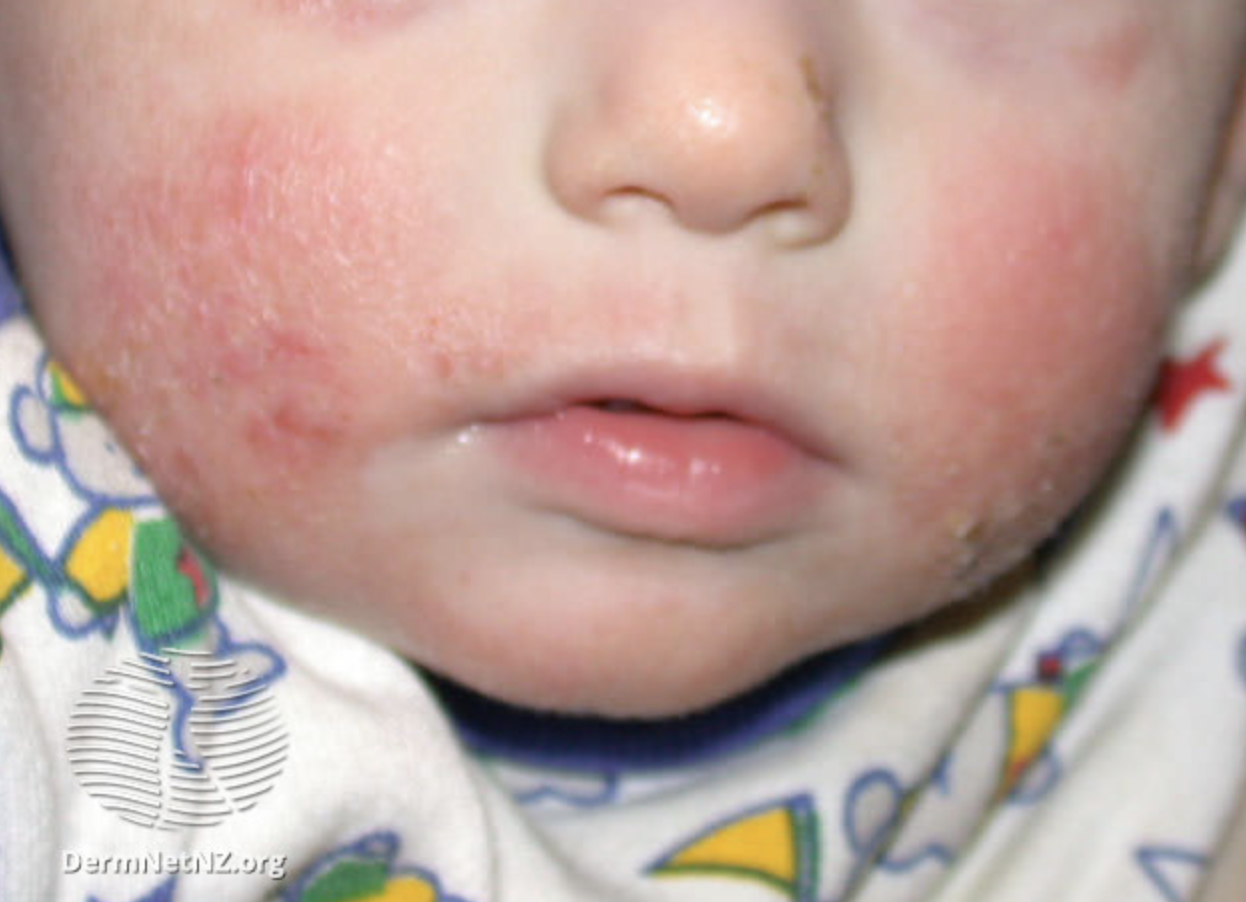 Fetal Heat : Appears between 2 and 6 months of age. Lesions typically begins on the face with swollen, weepy or crusty papules that are intensely itchy, disturbing baby’s sleep. They are often very thirsty, have dark urine, and the skin flares when they get sick or constipated.