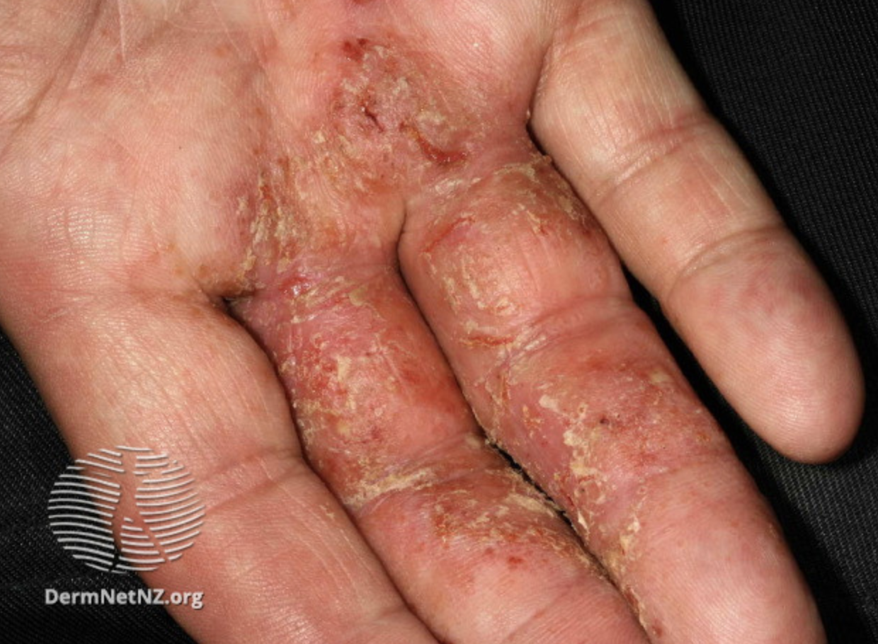 Damp Heat: Well defined, red, damp, swollen lesions that scab, ooze and crust yellowish fluid. Lesions tend to congregate on the palms and soles, lower body, and skin-folds.